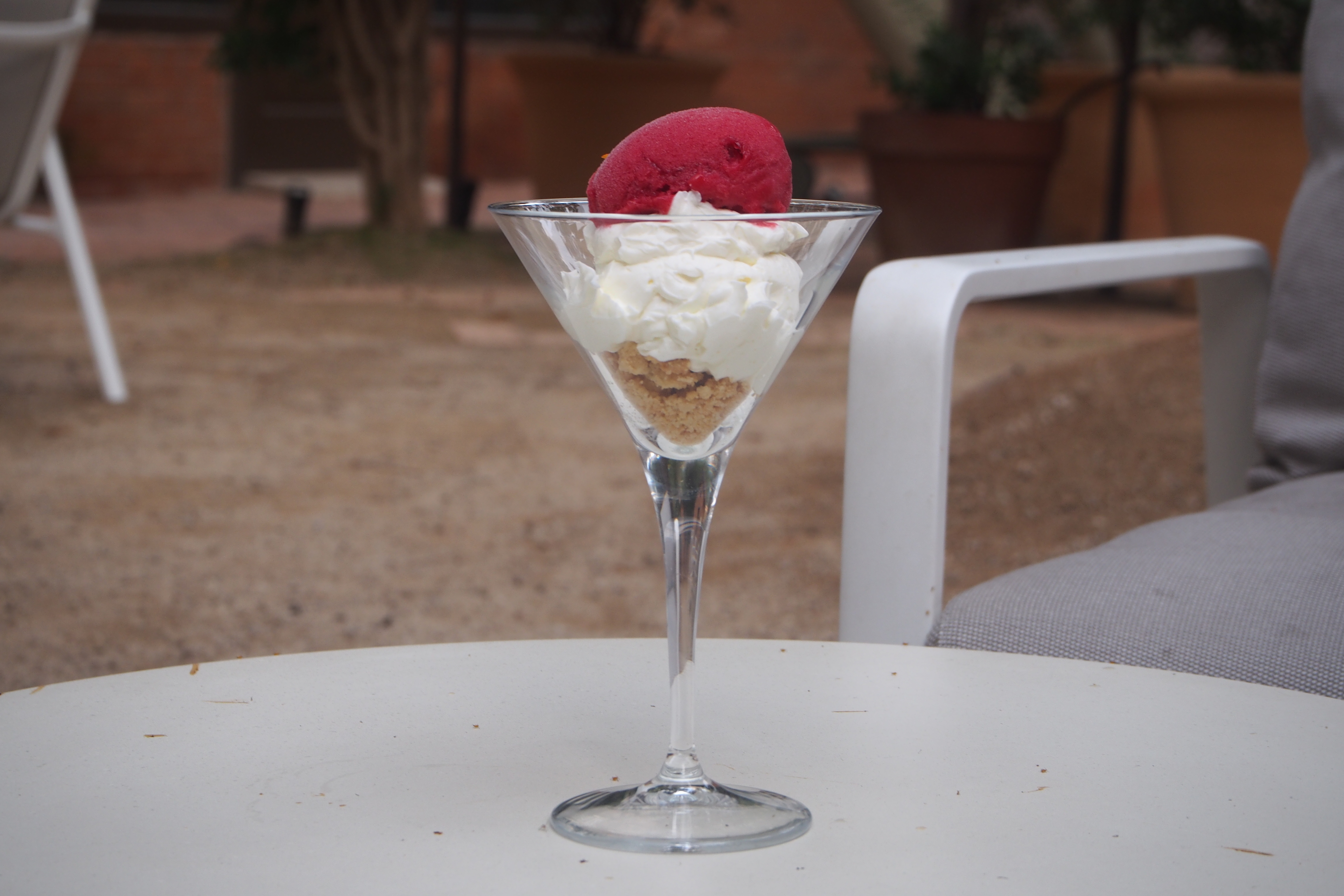 Crema de mascarpone con helado frutos rojos y crumble de galleta